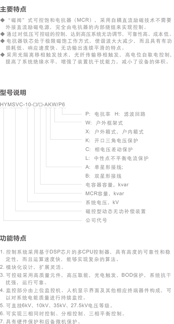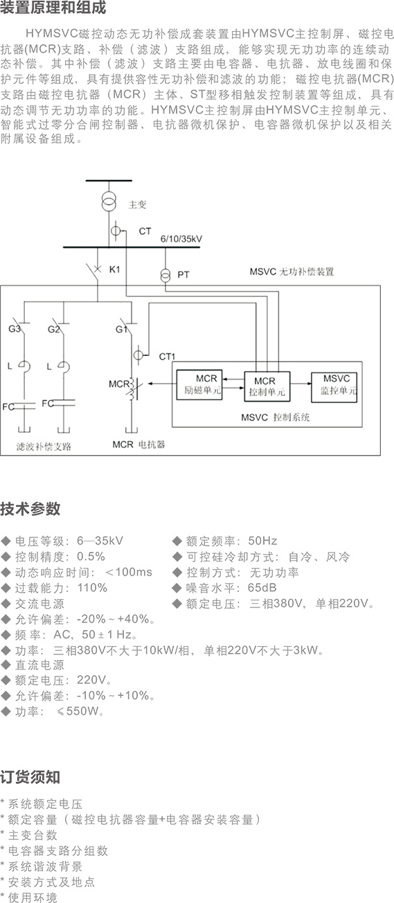 MSVC磁控動態(tài)無功補(bǔ)償成套裝置,是MCR、電容器分組投切和變壓器有載調(diào)壓功能為一體的無功補(bǔ)償及電壓優(yōu)化自動控制裝置。MCR是一種“磁閥”式可控飽和電抗器,通過直流控制電流的勵磁改變鐵心的磁飽和度,從而達(dá)到平滑調(diào)節(jié)無功輸出的目的,由于電容器分組,實現(xiàn)雙向無功動態(tài)連續(xù)調(diào)節(jié),另外MCR容量采用只需接近電容器單組最大容量,就能達(dá)到合理的補(bǔ)償要求,降低設(shè)備的造價,同時運(yùn)行損耗大大降低