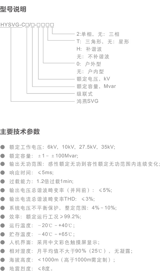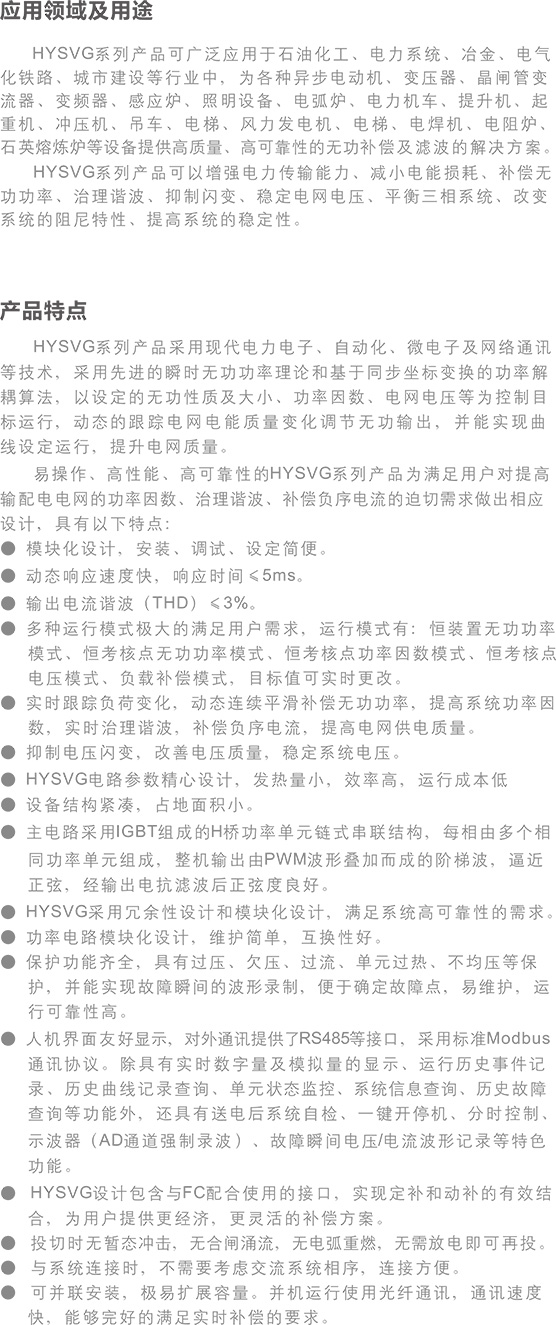 HYSVG系列高壓動(dòng)態(tài)無(wú)功補(bǔ)償裝置是以IGBT為核心的無(wú)功補(bǔ)償系 統(tǒng),能夠快速連續(xù)地提供容性或感性無(wú)功功率,實(shí)現(xiàn)考核點(diǎn)恒定無(wú)功、 恒定電壓和恒定功率因數(shù)等控制,保障電力系統(tǒng)穩(wěn)定、高效、優(yōu)質(zhì)地運(yùn) 行。在配電網(wǎng)中,將中小容量的HYSVG產(chǎn)品安裝在某些特殊負(fù)荷(如 電弧爐)附近,可以顯著地改善負(fù)荷與公共電網(wǎng)連接點(diǎn)處的電能質(zhì)量, 例如提高功率因數(shù)、克服三相不平衡、消除電壓閃變和電壓波動(dòng)、抑止 諧波污染等。