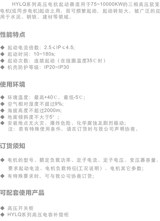 HYLQ系列高壓電抗起動器適用于75—10000KW的三相高壓鼠籠 電機(或同步電機)起動之用,因可頻繁起動,起動轉(zhuǎn)矩大,被廣泛的應(yīng) 用于水泥、鋼鐵、建材等領(lǐng)域。